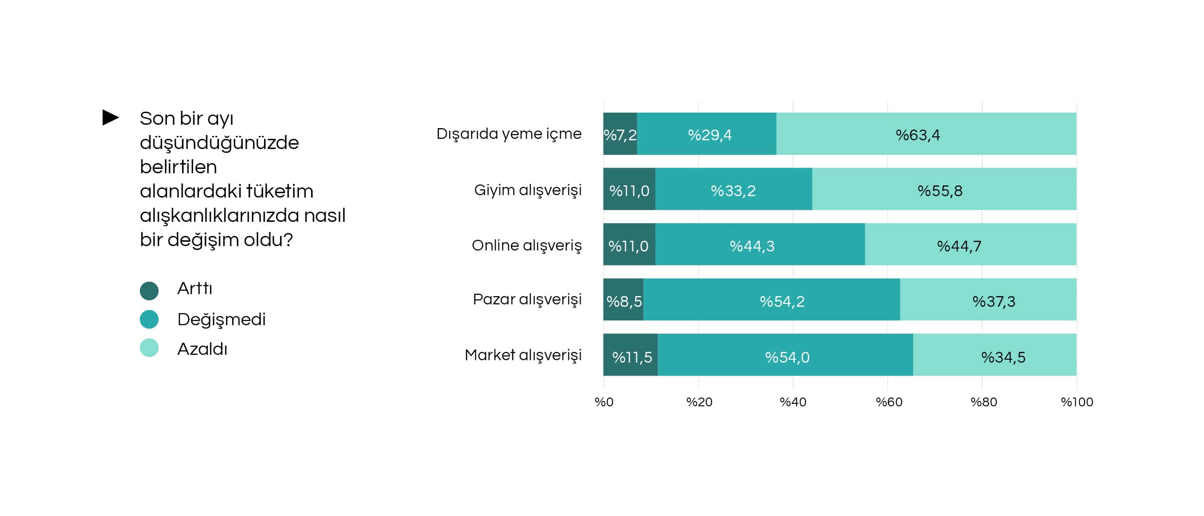 Son bir ayda dışarıda yeme- içme ve giyim harcamalarında da belirgin bir daralma yaşandı. Katılımcıların yüzde 63.4’ü son bir ayda dışarıda yeme içme alışkanlıklarında düşüş olduğunu söyledi. Katılımcıların yüzde 55.8’i giyim alışverişlerinde azalma olduğunu, yüzde 11’i artış olduğunu, yüzde 33.2’si ise değişmediğini kaydetti.