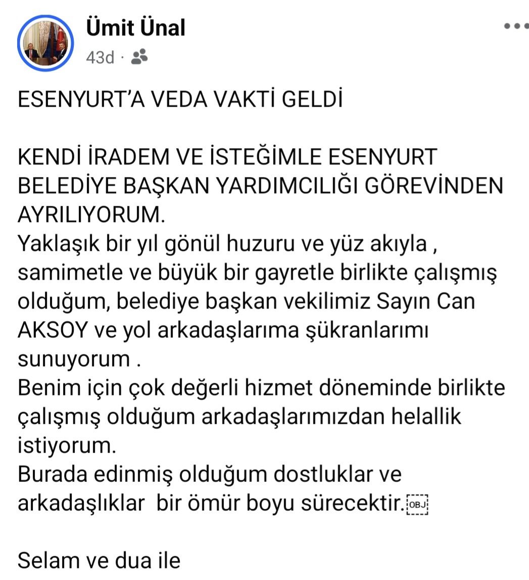 İstifa ettiğini kendi sosyal medya sayfalarından paylaşan, Ümit Ünal çalışma arkadaşlarından helallik istedi.